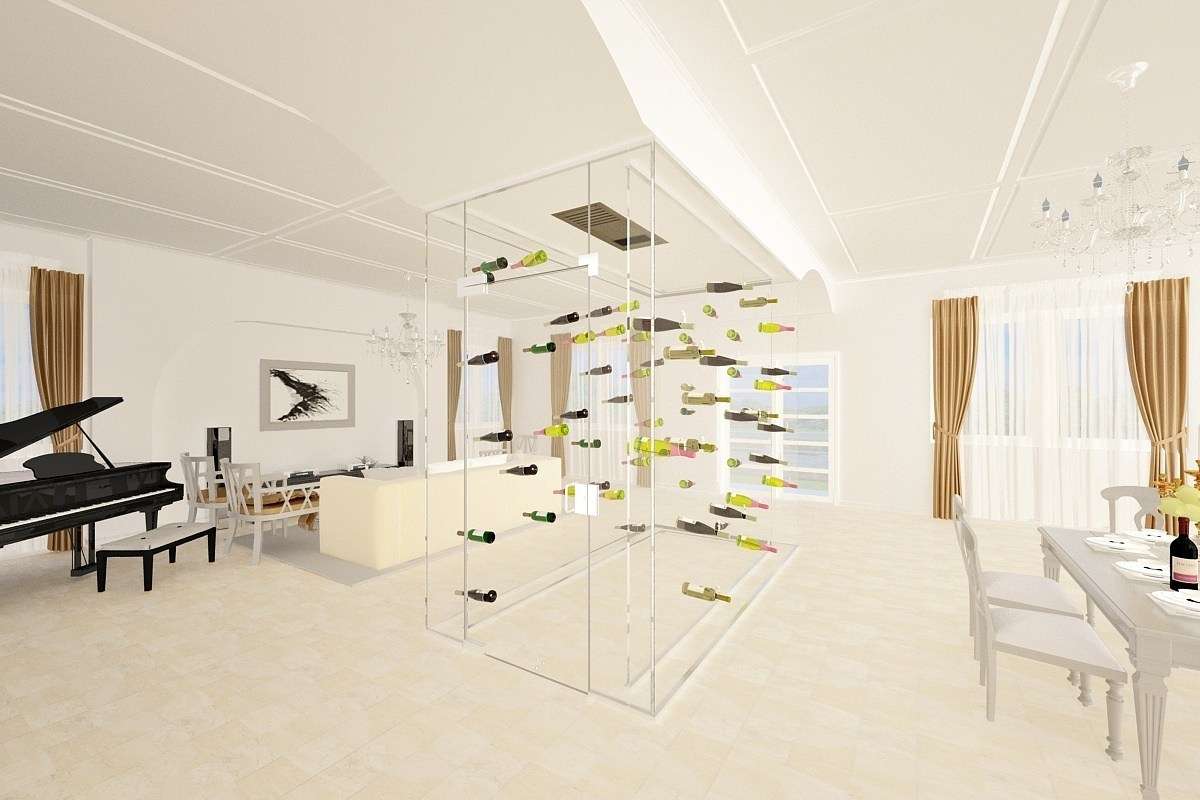 „Akrylátové stojany nabízejí prostorné a elegantní řešení jak pro veřejné prostory se skladováním vína, tak pro obytné prostory,“ sdělil Jim Deckebach, výkonný ředitel společnosti Wine Cellar Innovations (WCI). „To je důvod, proč je klienti tak milují.“ Společnost na svých webových stránkách prezentuje, jak lze akrylátové regály rozmanitě využívat v různých architektonických konceptech. Prvním je skutečný skleněný vinný sklípek s kapacitou 952 lahví. Designérský tým společnosti WCI se soustředil na správné chlazení a těsnění dveří, aby bylo zajištěno udržení ideálních podmínek skladování vína. Chladicí jednotka se montuje ze stropu, což není zrovna snadný úkol, ale společnost WCI má s instalací skleněných vinných sklípků víc jak třicet let zkušeností. Druhý projekt není ani regálem na víno, ani vinným sklípkem, ale transparentní dělicí příčkou vytvořenou z akrylátových stojanů. Není uzavřená ani chlazená, ale lahve jsou uloženy bezpečně a pohodlně. Vnáší do prostoru moderní a zároveň elegantní atmosféru.