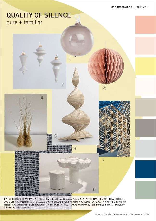 Téma QUALITY OF SILENCE_pure + familiar reaguje na sílící povědomí o tom, jak design blízký přírodě působí na duševní a fyzickou pohodu člověka. Tento styl je nejen o klidu a bezpečí domova, ale i o udržitelnosti a v maximální možné míře využívá vše, od dřeva až po listy a kůru, do posledního zbytku. Výjimečnost designu tohoto tématu tkví v jednoduchosti a známé a jednoduché materiály a předměty denní potřeby jsou zde vytrženy z původního kontextu a díky inovativnímu designu získávají nový neotřelý šarm. Experimentální výrobky v tomto trendu jsou neokázalé, poctivé, dlouho vydrží, a navíc působí jak důvěrně známě, tak i neobvykle. Z papíru k recyklaci vznikají puristické sochy a opakovaně použitelné artefakty z přírodních materiálů jsou atraktivní alternativou k živým vánočním stromkům. Designéři dokonce pomocí abstraktních tvarů nově interpretují i tradiční ozdoby na vánoční stromeček. Tento trend klade důraz na tichou krásu přírodních, zodpovědně zpracovaných materiálů a udržitelnou budoucnost. Holistický přístup k designu navozuje ve vyzdobených prostorách uvolněnou atmosféru a dobrou náladu.
